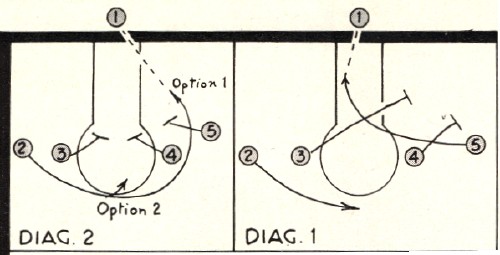 | In Diagram 1, players 3 and 4 screen for 5. Two covers defensively and is also available for an outlet pass in the event 5 is not open. In the event of a shift, 3 or 4 should be open. In Diagram 2, 3 and 5 start just as in Diagram 1. Four seals the center. Two starts as in Diagram 1 but uses 3, 4, and 5 to screen off his opponent. |