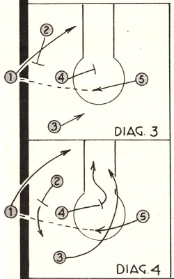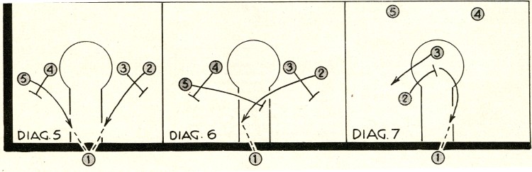 | In Diagram 3, 2 screens for 1. Four screens for 5. One passes to 5, cuts for the basket taking a return pass from 5. Three maneuvers in order to be available for an outlet pass. In Diagram 4, 2 screens for 1 and comes out to cover defensively. Four screens for 5, then cuts to his left into rebounding position. One passes to 5 and cuts for the basket. Three cuts off 5 using him as a post, taking a hand-off pass from 5. |