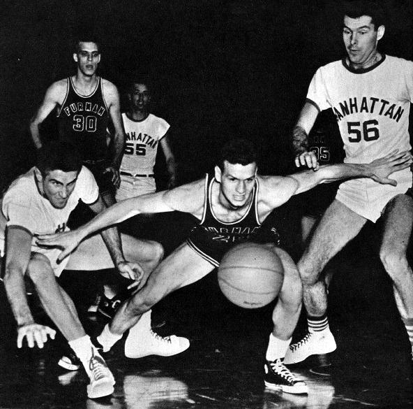 | Furman College's 1954 team featuring Frank Selvy (center) was typical of clubs that jump to spotlight from nowhere. |