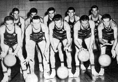 | The University of Kentucky Wildcats plus two outsiders prepare for the N.C.A.A. Olympic Fund three-game series with the Phillips 66'ers. From left to right (Back row); Wallace 'Wah Wah' Jones, Vince Boryla, Alex Groza, Joe Holland and Dale Barnstable. (Front row); Ray Lumpp, Kenneth Rollins, Jim Line Cliff Barker and Ralph Beard |