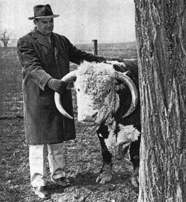 | Coach Adolph F. Rupp literally takes the bull by the horns as he looks over his 11-year-old MW Domino 65th, a son of Colorado Domino 159th. |