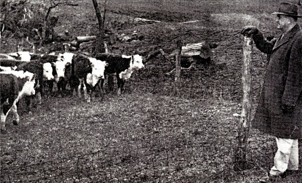 The Baron of basketball has now become the Baron of a small cattle empire. He leaves his car for a walk around the pastures and reminds you that this is the second time since the first of the year that he has found time to visit his herd of Herefords.