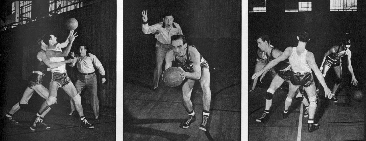 | BECAUSE OF THE SPEED of the game this trick is rarely noticed by the spectators. Attempting to get past the defense man (light shirt), the dribbler "gives him the elbow"-a violation of the rules. And how the fans howl when the dribbler goes ahead to make a basket and we call the play back because of the foul! | THIS IS A CLEVER STUNT pulled by some players in an effort to distract the attention of the man shooting a foul shot so that his aim is spoiled. Just as the shooter is letting the ball go, his clever opponent (light shirt) waves his arm in the air, pretending to give some instruction to a teammate up the court. | THIS IS THE PET TRICK of the little fellows. In a scramble for a ball rebounding from the basket, small players frequently try to compensate for their short stature by climbing up on the shoulders of their taller opponent. A clever player does this under the pretext of trying a follow-up shot. |