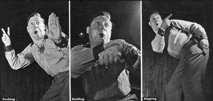 | TO MAKE OURSELVES CLEAR above the din we use a set of signals describing the fouls we call and other decisions we make. Three of these signals are shown in these pictures. The one on the left says a man has pushed his opponent who therefore gets two free shots. The one in the center is for holding, the one at the right for illegal blocking with the hips. Other signals in common use include: blocking - both hands on hips; running with ball -- clenched fists revolved in circular motion; hacking -- striking arm with edge of palm; kicking ball -- forward and backward motion of leg; charging -- forward movement of stomach; time out -- scissors-like crossing of arms. |