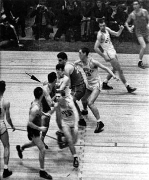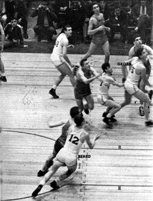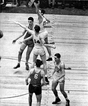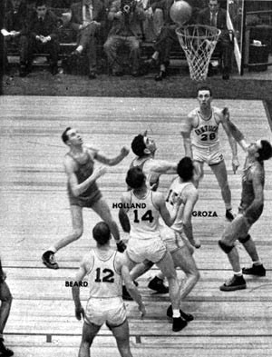 | The eyes of every player follow a St. John's shot. Beard, No. 12, and Groza move in toward the basket to gain possession of the ball on the rebound. | Tense, eager Joe Holland, No. 14, and Groza are set to fight 6' 9" Boykoff for the ball. Beard stands off to the side, ready to take a quick pass. |