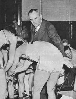 The varsity was rehearsing a play under the immediate supervision of an assistant. Rupp stood off watching. The execution of the play didn't satisfy him. He let them know it. As Adolph ranted and raged, the assistant called the players back and patiently wont over the assignments. "Hah," the skeptic said. "As I thought. There's the real coach." The players tried again. Again they failed. Now Rupp moved in on them and really went into a tirade.