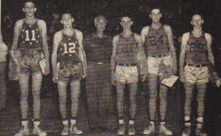 ![]() | 1955 HIGH SCHOOL All-AMERICANS - as selected by Chuck Taylor, coaches and sports writers at North-South Classic: (L-R): Ruklick, Ryan,, Chuck Taylor, Byrd ("Mr. Basketball"), Howell and Johnson, holding their award certificates. |