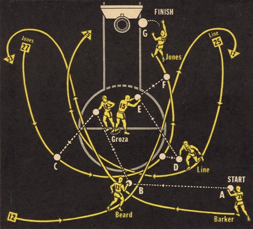 Strategy. In such a situation, one of the Kentucky guards - guards correspond to football quarterbacks on the Baron's teams - signals a play. Rupp has 10 such floor plays, workable from either side. The center moves to the foul line under the opponent's basket and acts as pivot man for receiving and making passes.