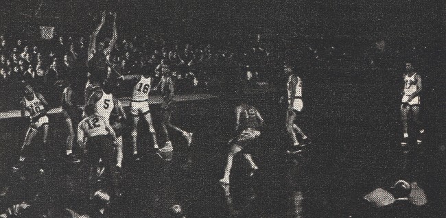 In addition to total points, Mikan holds 19 records including highest points-per-game average, most goals made, most fouls made. Mikan scores nearly as many points on tap-ins under the basket as he does on set shots. He credits his grandmother for that fact: she made him practice piano-playing so much his fingers developed the strength and instinctive touch needed for under-the-backboard scrambles.