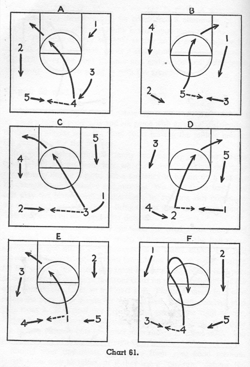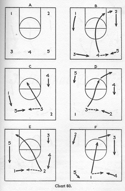 The movement starts when our team has tried a fast break and has failed to get the shot, or when it has brought the ball down slowly and got set in our positions as in Chart 60A. The ball moves to the player cutting from the sideline and the passer cutting for the goal. If the passer gets open he should be given a lead pass as he goes to the comer of the front court on the opposite side of the court that he cuts from, as in Chart 60B. Player 4 passes to 5 who meets the pass. No.4 cuts for the goal and, if open, receives lead pass from 5. If 4 does not get open he goes to the right comer. - Player 5 now passes the ball to 3 and cuts for the goal. If 5 does not receive pass, he cuts to corner as is shown in Chart 60C. The play continues as is shown through Charts 60 and 61.