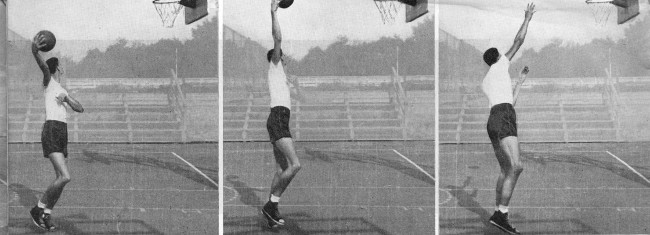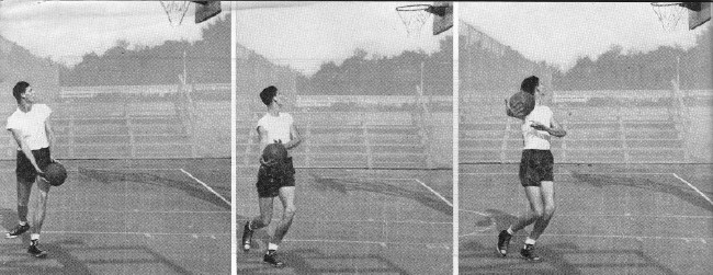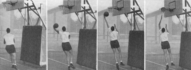 He may also employ a jump shot by leaping in the air, turning, and letting go with both hands; or he may take a dribble to one side and take a one-handed or two-handed shot from there. The shot he takes is again determined by the way his man plays him.