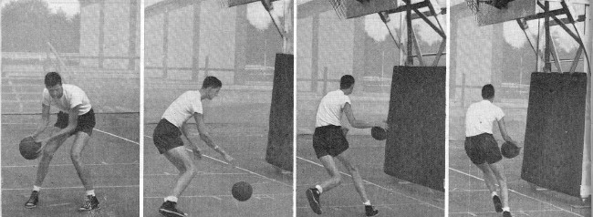 In shooting, our pivot man has the option of taking a dribble to the weak side of his guard and using a lay-up or he may employ a slide dribble to score. That is, he may go back to the basket and instead of taking a one-step pivot jump shot, he may slide both feet and then take off with the foot nearer the basket.