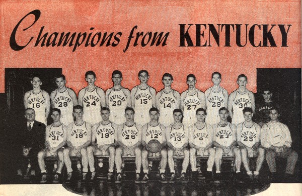 "I've used three centers this season - Alex Groza, Bob Brannum, and Wah-Wah Jones. Jones is from the biggest town, Harlan, Kentucky, about 8,000. Groza from Martin's Ferry, Ohio. Brannum is from Winfield, Kansas. None of those places is what you could call overpopulated. I guess Ralph Beard, one of our starting guards, is from the biggest town Louisville, but he was raised at nearby Lewisport. Kenny Rollins the other starting guard, is from little Wickcliffe, Kentucky, a community of only 250 even on the Sundays when the traveling elder conducts church services.