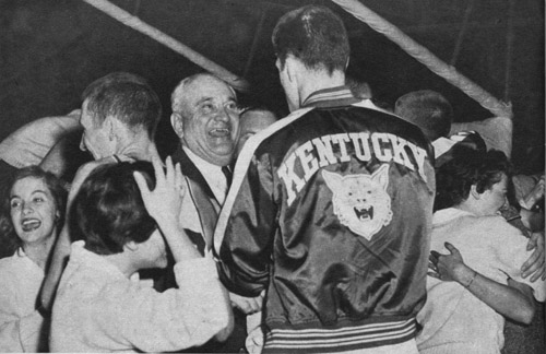 | Bedlam breaks out at end of final NCAA tourney game that Kentucky won to take title last year. Here Kentucky's jubilant Coach Adolph Rupp is all smiles as he receives congratulations from players, fans and cheerleaders. |