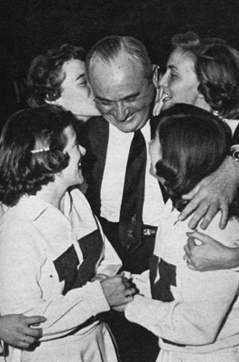 | Kentucky's comely cheerleaders show their affections for Coach Rupp after the "Baron" led his Wildcats to unexpected victory in NCAA tournament last year at Louisville. | Fast action catches Temple's Bill Kennedy in pursuit of loose ball, as Kentucky's Vernon Hatton also gives chase. Kentucky got by Temple 61-60 in this NCAA tourney game. |