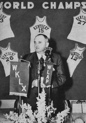 | Photo made in 1949 shows Coach Rupp addressing alumni group. That year Wildcats won Kentucky's 6th consecutive SEC titel and their second NCAA tourney crown. | In NCAA tourney game Kentucky's John Crigler (L) and Ed Beck (34) get ball away from Temple's Tink Van Patton. Johnny Cox (24) recovered ball and scored for Kentucky. |