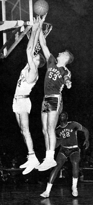 | Seattle's Don Ogorek (53) fouled Kentucky's Johnny Cox on this play in the final NCAA tilt last year. Elgin Baylor, Seattle, is in the background. |