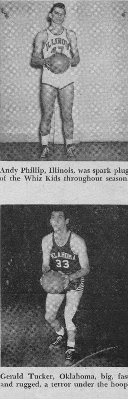 GERALD TUCKER: Returned to Oklahoma after serving as first lieutenant in Army, coaching and playing with the 41st Division team of Honshu, Japan, that won the National Service basketball championship. Holds Big Six individual scoring record of 175 points for one season of 10 games and of 38 points for one game. A powerful 6' 4" 208-pounder, who is impossible to move under the boards. Works off the pivot and taps in rebounds. After watching him score eight field goals against Wisconsin, Roundy Coughlin, the newspaper sage of Madison, Wisconsin, wrote:. "This Tucker is the best visiting basketball player I have ever seen in the fieldhouse here and I was here when they built it, too." Native of Winfield, Kansas.