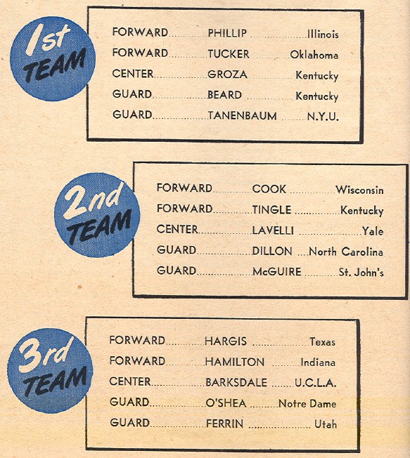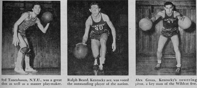 RALPH BEARD: At 5' 10", smallest regular on Kentucky's slick outfit. Despite lack of height is tower of strength under both boards. A streak of lightning down court, can dribble ball down floor faster than most players can run. A very good outside pop shot, Beard's speed enables him to cut and drive through for numerous lay ups. Always assigned to enemy's strongest offensive player. A leech on defense throttling the best. Held Ernie Calverley, Rhode Island State star, to eight points in Metropolitan Invitational Tournament finals, last winter, after Ernie scored" in very high brackets during quarter and semifinal contests. A native of Louisville, Ky., Beard was voted Player of the Year by coaches and sports writers.