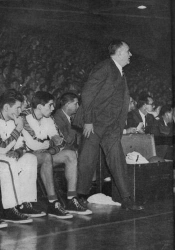 In his relationships with the players, Rupp is at once severe and aloof. Practice sessions are conducted in an eerie silence broken only by the pounding of feet and the ball thudding against the backboard and the floor. Horseplay and kidding are strictly taboo. "No visiting during practice!" Rupp yells sharply if two players exchange a few pleasantries. Every session is marked by the precision and intensity of a football workout. The first half hour is devoted to shooting, with the players moving continually to designated spots on the floor. During the next half hour the men line up and run through the eleven basic plays they are taught as freshmen. A long scrimmage, generally a good deal more strenuous than an actual game, concludes the workout with Rupp and Lancaster observing silently from opposite ends of the court. Rupp seldom interrupts the action to correct a mistake. That comes later, when he analyzes each man's performance and scouting reports of the forthcoming game.