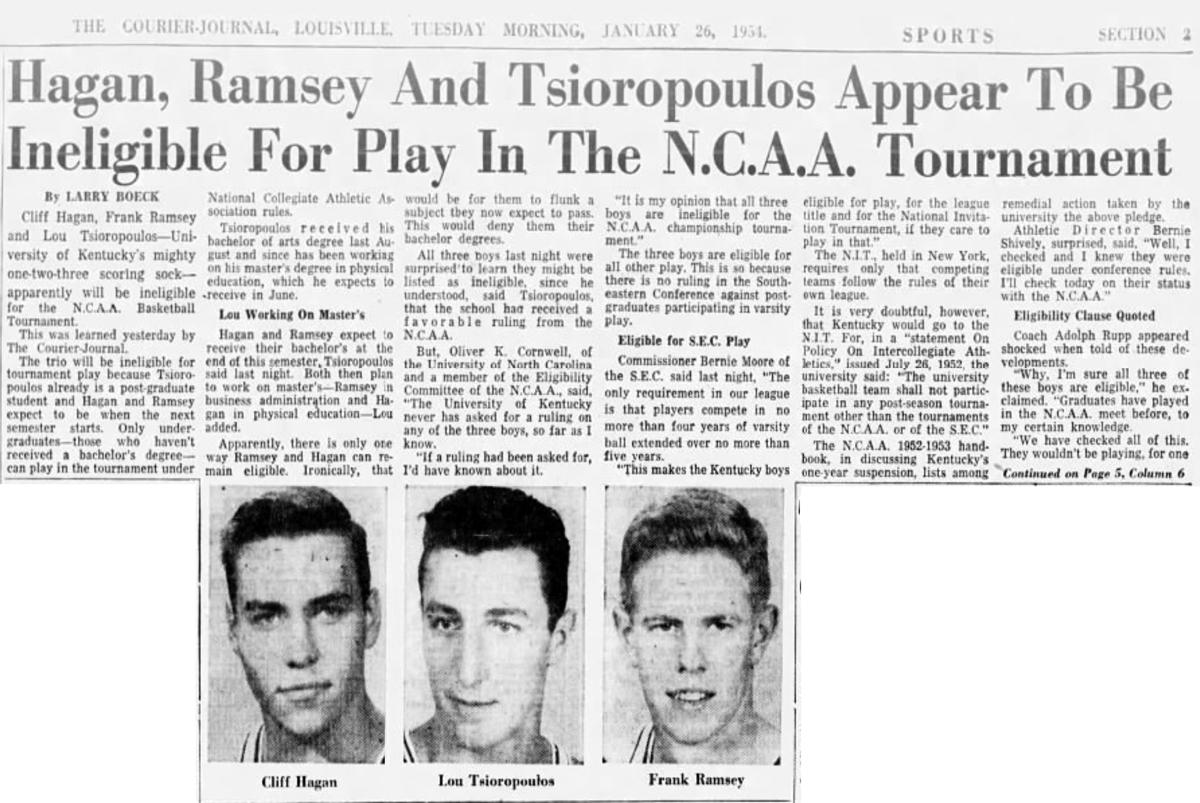 The other lingering point of contention dealt with the eligibility of UK's three returning seniors (Cliff Hagan, Frank Ramsey and Lou Tsioropoulos), who formed the core of their squad. Since the three either had already graduated (or were due to graduate before the spring semester) and were finishing their basketball eligibility as graduate students, they were technically not able to compete in the NCAA tournament according to a rule on the books at the time (although they were still eligible to compete in the regular season).