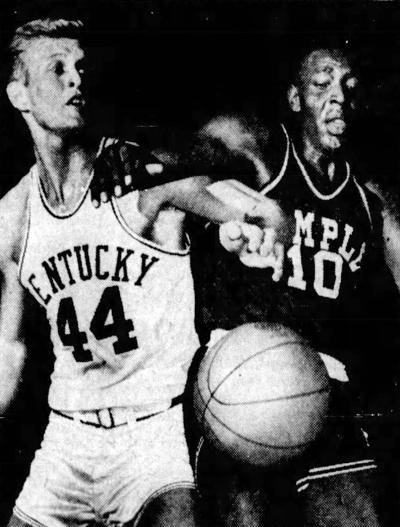 Carroll Burchett (#40) and Temple's Ed Devery (#4) fight for the rebound