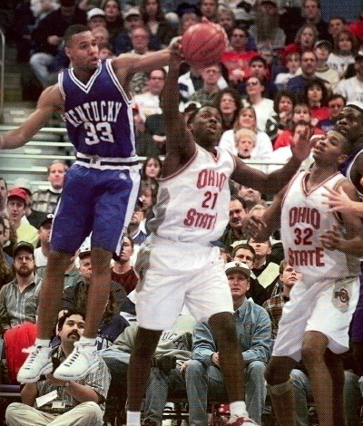 Ron Mercer (#33) fights Ohio State's Carlos Davis (#21) for the ball