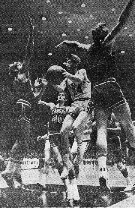 Ronnie Lyons gets caught between three Jayhawks: Tom Kivisto (left), Dale Greenlee (#40) and Dale Haase (#20)