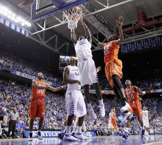 Alex Poythress (#22) dunks ahead of UT-Arlington's Kevin Hervey (#25) while UK's Dakari Johnson (#44) and UT-Arlington's Courtney Austin (#30) and Johnny Hill (#10) look on