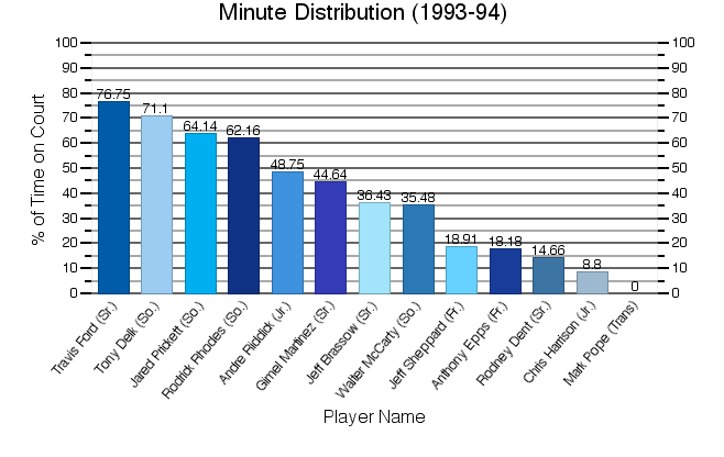| Tony Delk | 34 | 970 | 200 | 440 | 45.45 | 95 | 254 | 37.4 | 69 | 108 | 63.89 | 111 | 42 | 153 | 59 | 64 | 21 | 70 | 59 | 564 | 16.59 |